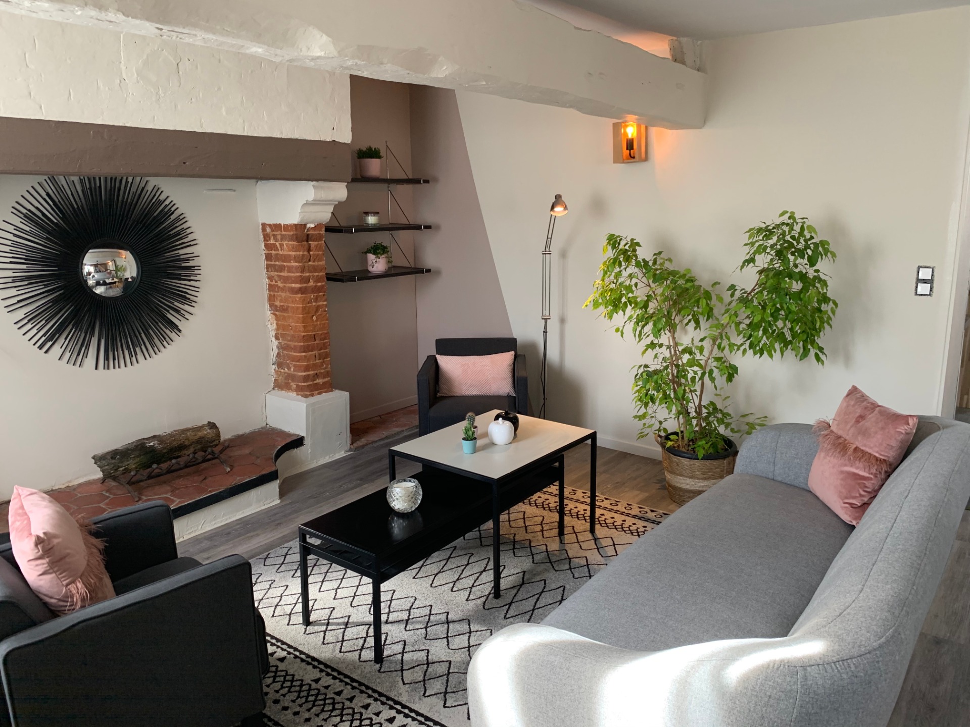 Le salon principal avec sa grande cheminée, ses poutres et ses murs de pierres. Il fallait juste tout mettre en valeur en toute sobriété.