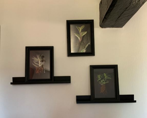 Pour le salon TV, je me suis inspiré des briques rouges de la cheminée, ainsi que de la poutre qui avait déjà été peinte en noir. Pour jouer avec la faible hauteur sous plafond des compositions de lierres ont été placées à différents niveaux.